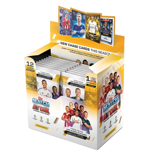 Match Attax UCL 2025/26 Display Box från Topps är ett måste för fotbollssamlare som vill bygga en stor och varierad Champions League-kollektion. Displayen innehåller 32 boosterpaket med 12 kort per paket, vilket ger totalt 384 officiella Match Attax-kort. Setet inkluderar dessutom minst 1 garanterat Hero-kort, tillsammans med spelarkort från UEFA Champions League, Europa League och Conference League.