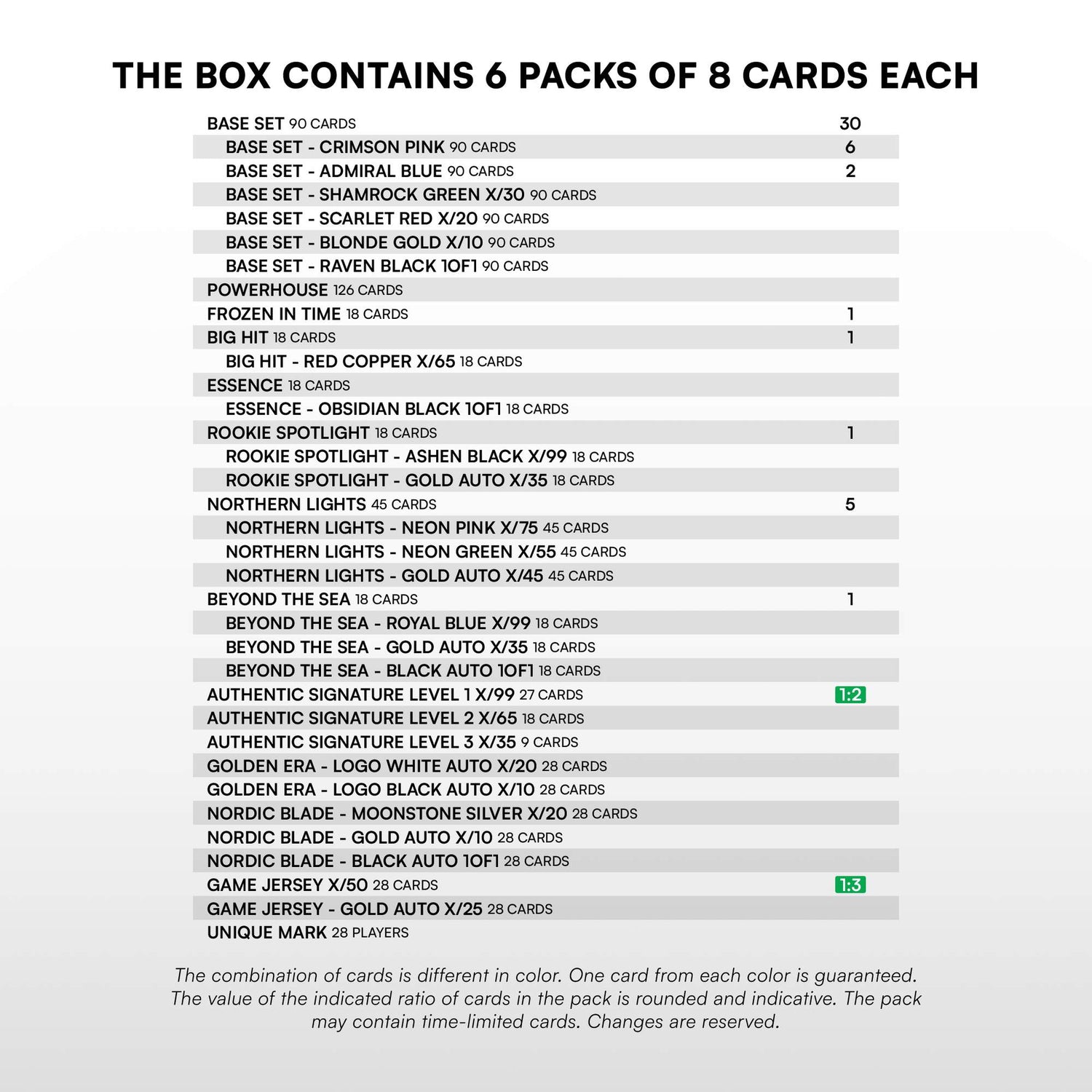 I blaster-boxen ingår garanterat: 30x Base Set, 6x Base Set - Crimson Pink, 2x Base Set - Admiral Blue, 1x Frozen in Time, 1x Big Hit, 1x Rookie Spotlight, 5x Northern Lights, 1x Beyond the Sea